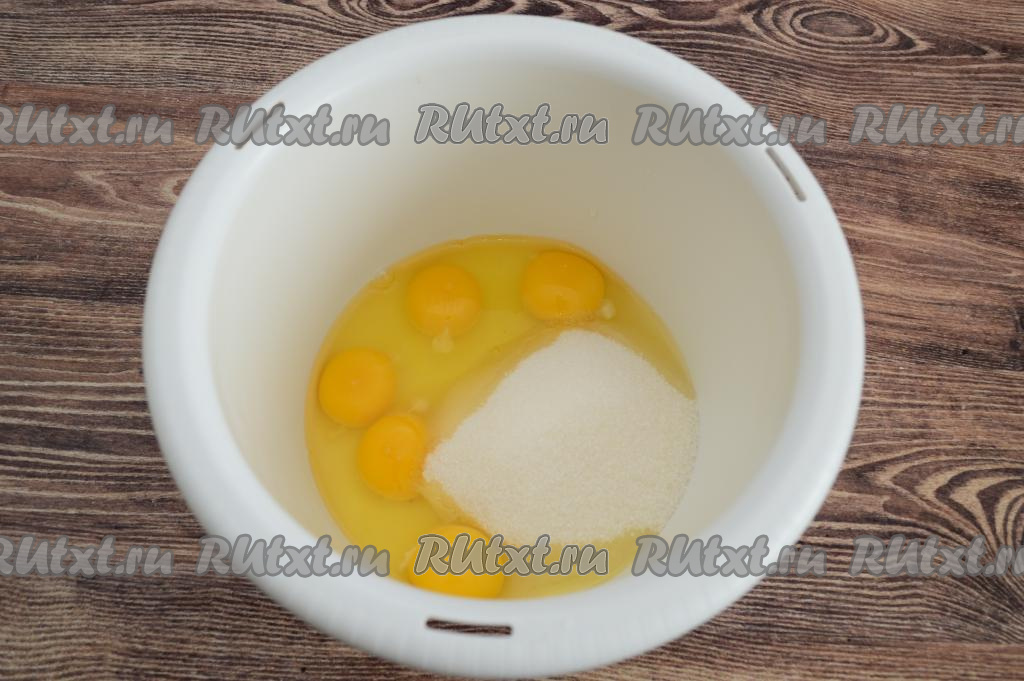 В чашу для взбивания миксером вбить сырые яйца, сразу всыпать сахар.