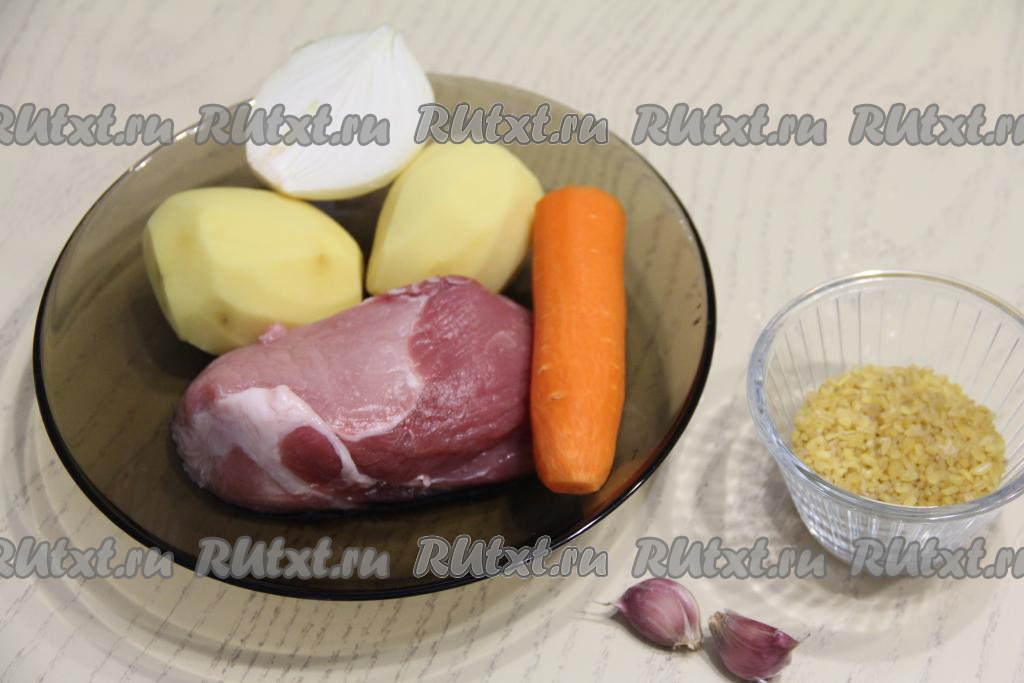 В кастрюлю со сварившейся свининой выложить картошку с морковью, всыпать булгур (предварительно промывать булгур не нужно).