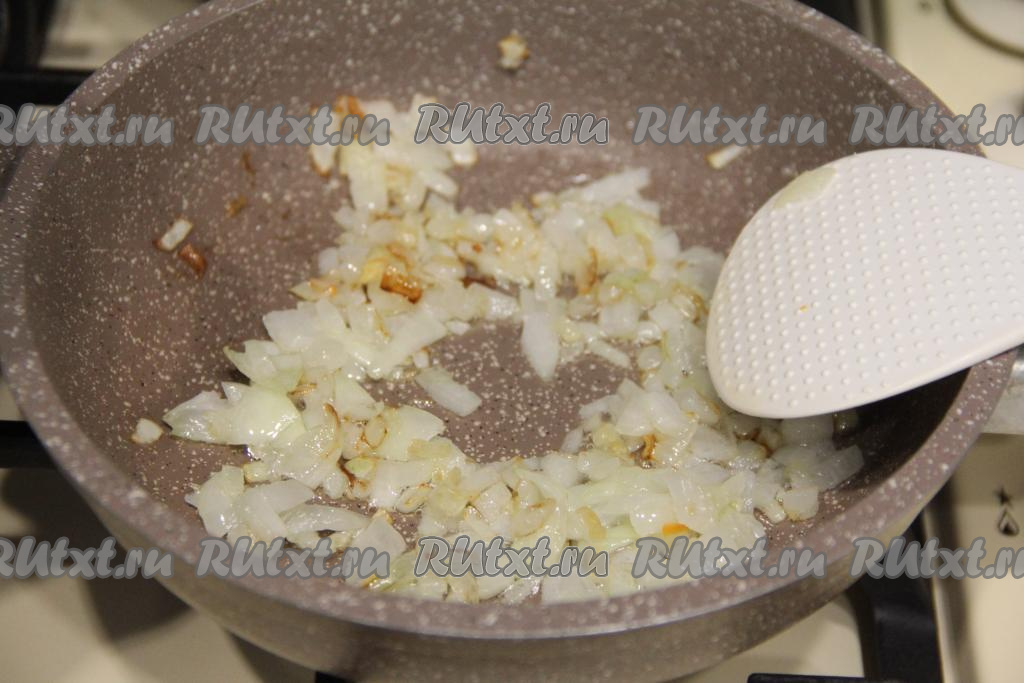 Перемешать, довести до кипения и варить суп с булгуром и свининой на небольшом огне 15 минут. Пока варятся овощи с булгуром, нужно в сковороде прогреть растительное масло, выложить мелко нарезанный лук и обжарить его на среднем огне, помешивая, в течение 4-5 минут (до золотистости лука).