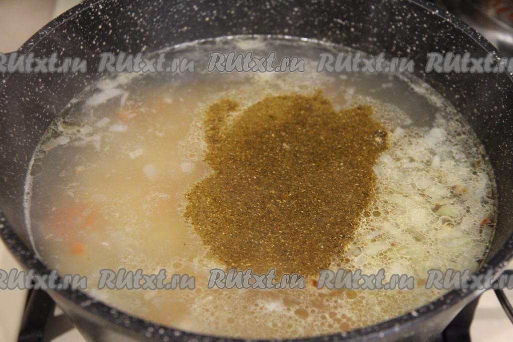 После того как картошка с булгуром проварятся с момента закипания 15 минут, добавить в суп жареный лук, соль, пропущенный через пресс чеснок, специи по вкусу, довести до кипения и уменьшить огонь.