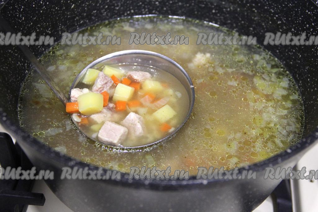 Варить суп с булгуром и свининой минут 10, затем снять кастрюлю с огня и дать настояться под крышкой в течение минут 15.