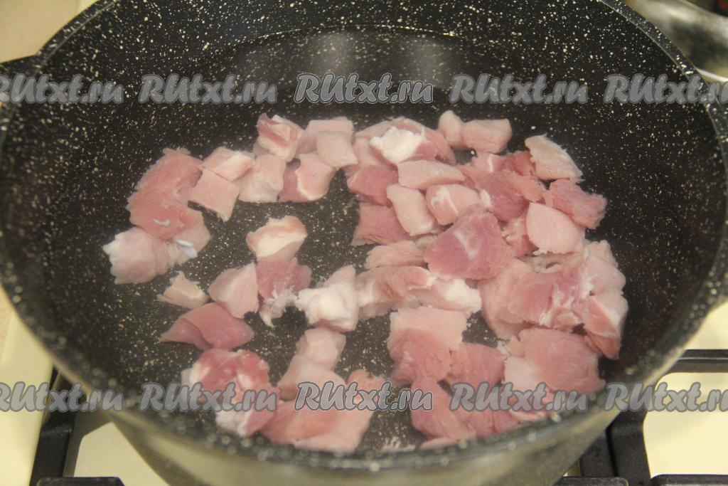 Свинину промыть водой. Мякоть свинины я нарезала на кубики размером 2 сантиметра на 2 сантиметра. Нарезанную мякоть свинины (или свинину на кости) выложить в кастрюлю, залить 2 литрами воды, поставить на достаточно сильный огонь. После закипания воды уменьшить огонь, убрать с поверхности бульона пену.