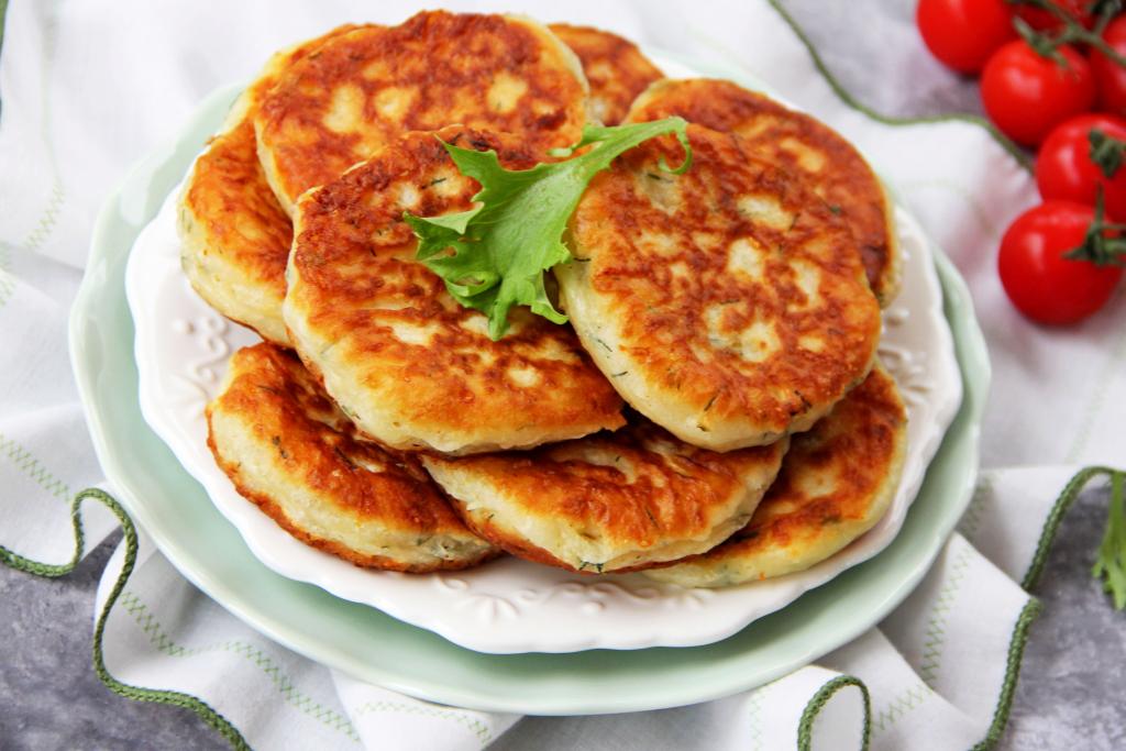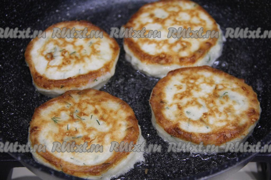 В сковороду влить растительное масло, хорошо разогреть на достаточно сильном огне. После этого уменьшить огонь до среднего, выкладывать по 1 столовой ложке сырного теста с зеленью в виде круглых оладий.