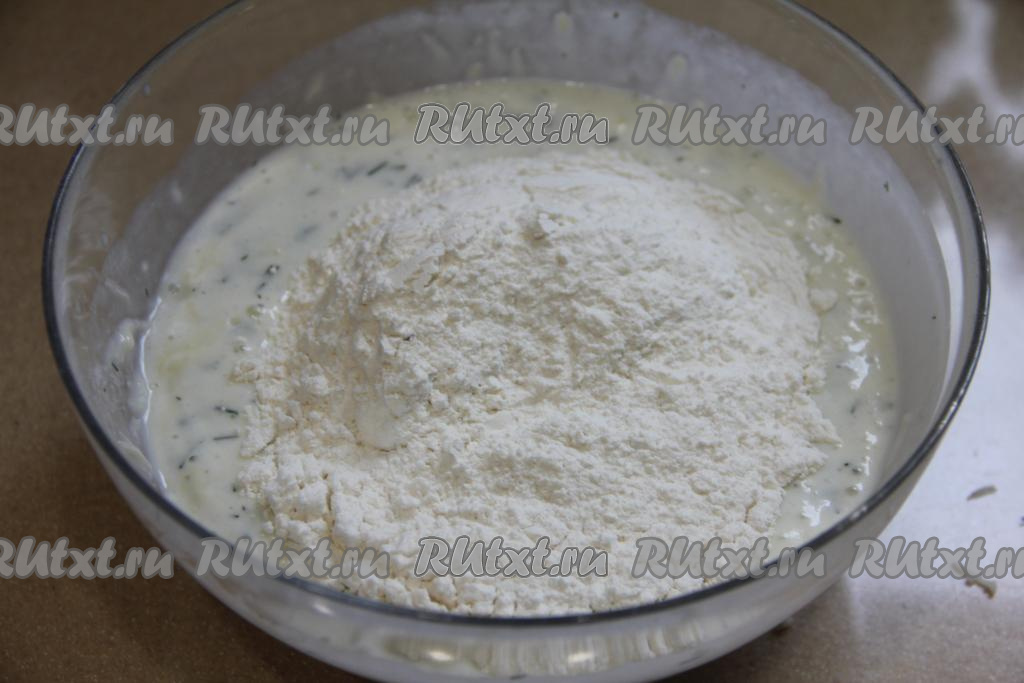 Перемешать массу венчиком до однородности, всыпать 100 грамм просеянной муки, соль и сахар, перемешать тесто столовой ложкой до однородности.