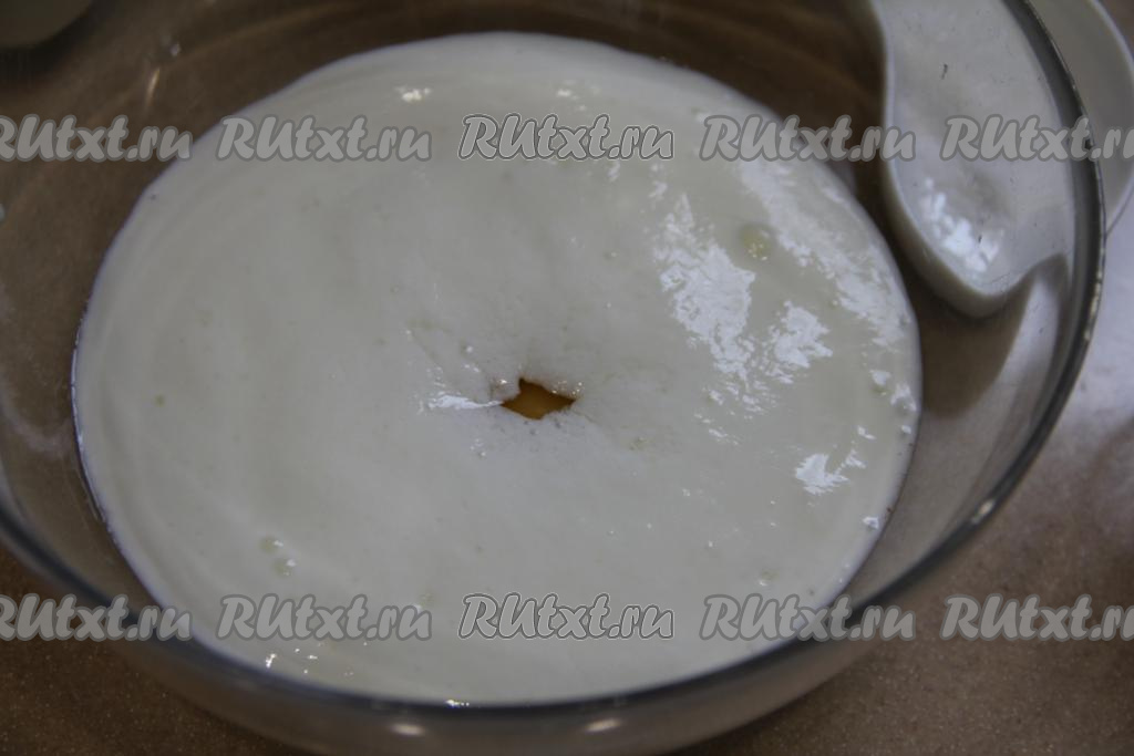 Частями добавляя оставшуюся просеянную муку, замесить однородное, в меру густое тесто для оладий, как на фото.