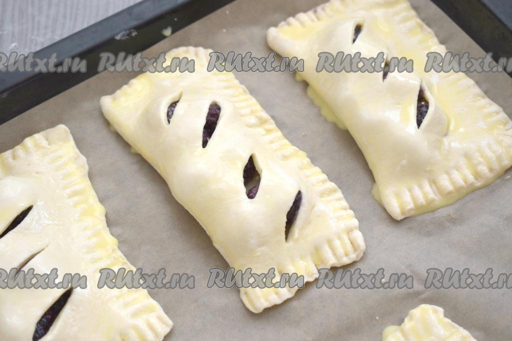 Сформированную слойку с ежевикой выкладываем на противень, застеленный пергаментом. Аналогично формируем ещё 3 слойки с ягодами, тоже выкладываем их на застеленный противень. В небольшой ёмкости (например, в стакане) яичный желток взбиваем до однородности с 1 столовой ложкой молока. Получившейся яично-молочной смесью смазываем наши слойки.