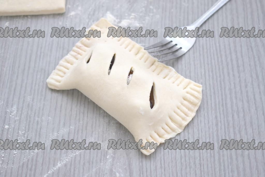 Если вилка будет сильно липнуть к тесту в процессе скрепления краёв, тогда периодически обмакивайте зубцы вилки в муку.