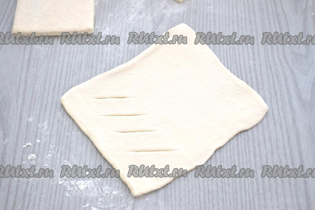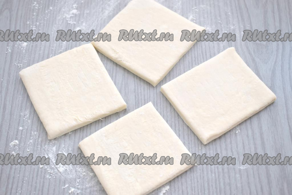 Стол присыпаем немного мукой, выкладываем пласт размороженного слоёного теста. Разрезаем тесто на 4 квадрата.
