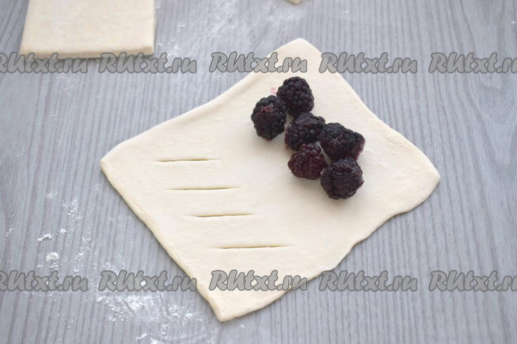 Для приготовления слоек заранее размораживаем слоёное тесто при комнатной температуре. Для этой выпечки можно взять как дрожжевое, так и бездрожжевое слоёное тесто. Ежевику можно взять как свежую, так и замороженную. Свежие ягоды нужно будет промыть проточной водой. Я готовила с замороженной ежевикой, её нужно будет слегка разморозить, лишнюю жидкость слить. Затем свежую (или размороженную) ежевику нужно будет разложить на бумажном полотенце и оставить на несколько минут, чтобы удалить лишнюю влагу.