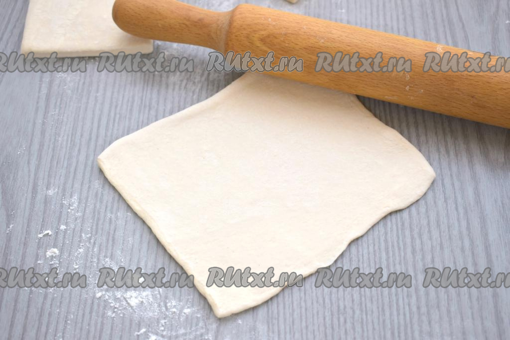 Квадрат из теста раскатываем скалкой в прямоугольник толщиной 2-3 миллиметра.