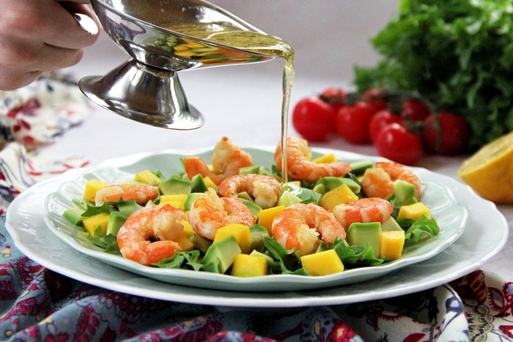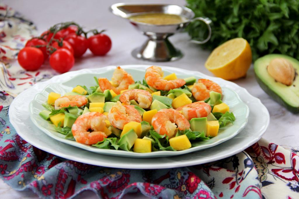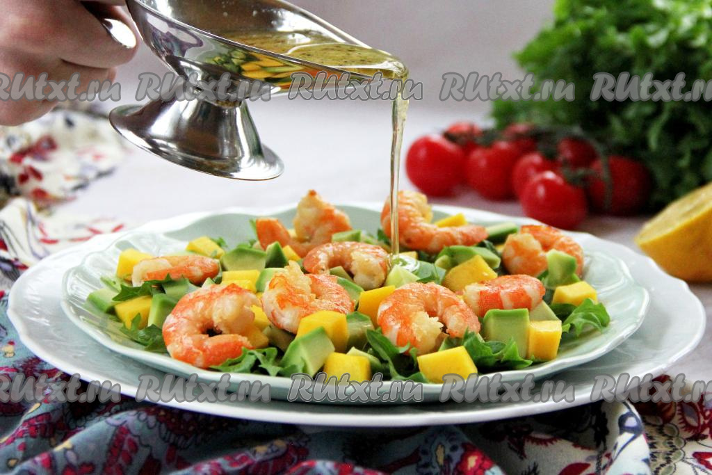 Яркий, вкусный салат, приготовленный с креветками, манго и авокадо, полить ароматной подготовленной заправкой и сразу подать к столу.