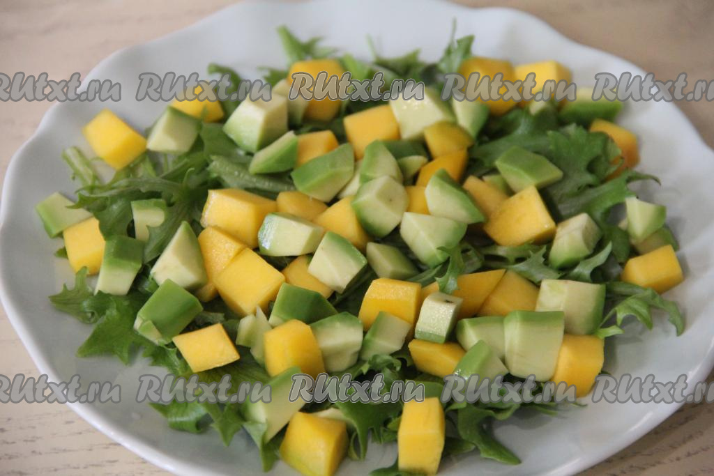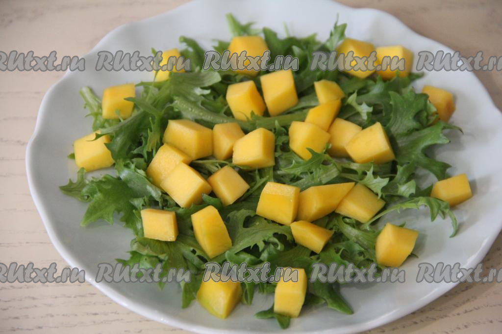 Манго очистить от кожуры и нарезать на кубики размером примерно 1 сантиметр на 1 сантиметр. Выложить кубики манго на листья салата.