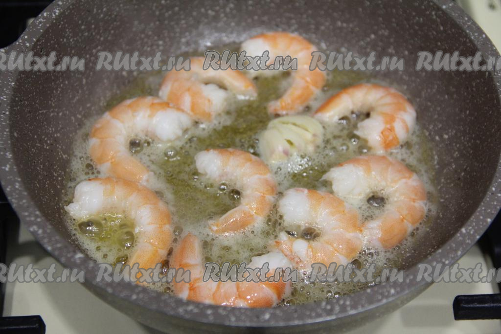 Выложить в разогретое чесночное масло очищенные креветки и обжарить на среднем огне по 1 минуте с каждой стороны. Переложить жареные креветки со сковороды на тарелку, дать немного остыть.