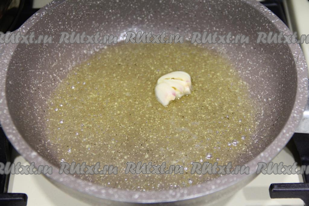 В сковороду выложить небольшой кусочек сливочного масла и раздавленный плоской частью лезвия ножа очищенный зубчик чеснока. Разогреть масло с чесноком, периодически переворачивая чеснок.