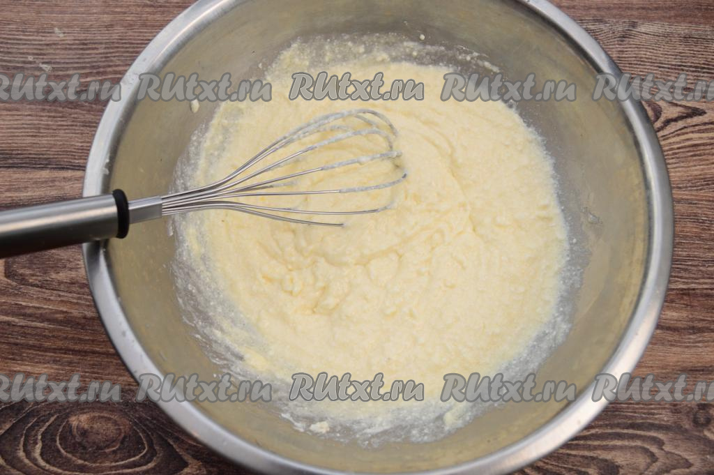 При помощи венчика смешать яйца, сахар и творог до получения однородной массы.