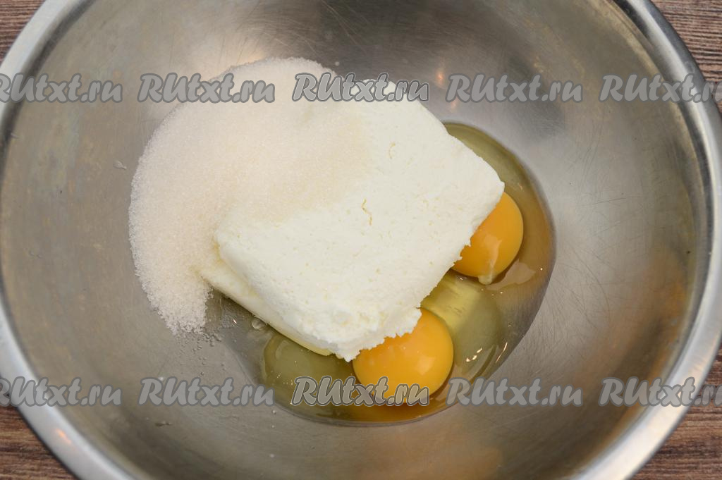 В отдельную миску выложить творог, добавить сахар и сырые яйца.