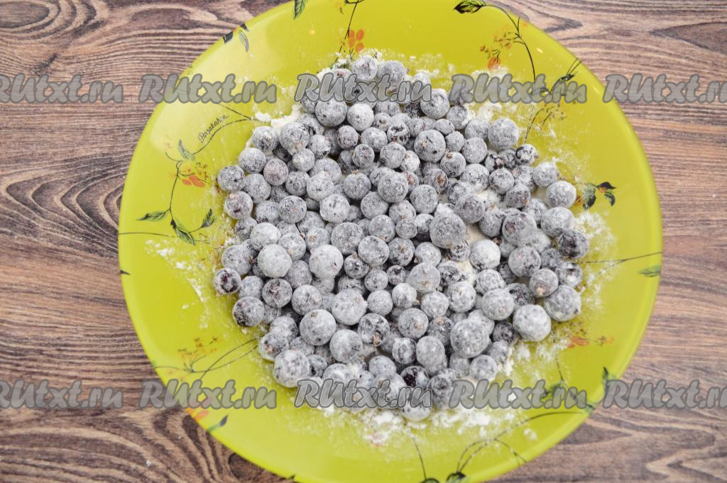 После того как бисквитное тесто будет замешано, нужно в тарелку всыпать подготовленную чёрную смородину, добавить 10 грамм муки, тщательно перемешать, покрывая ягоды мукой со всех сторон. Смородина, обваленная в муке, будет лучше распределяться по бисквитному тесту.
