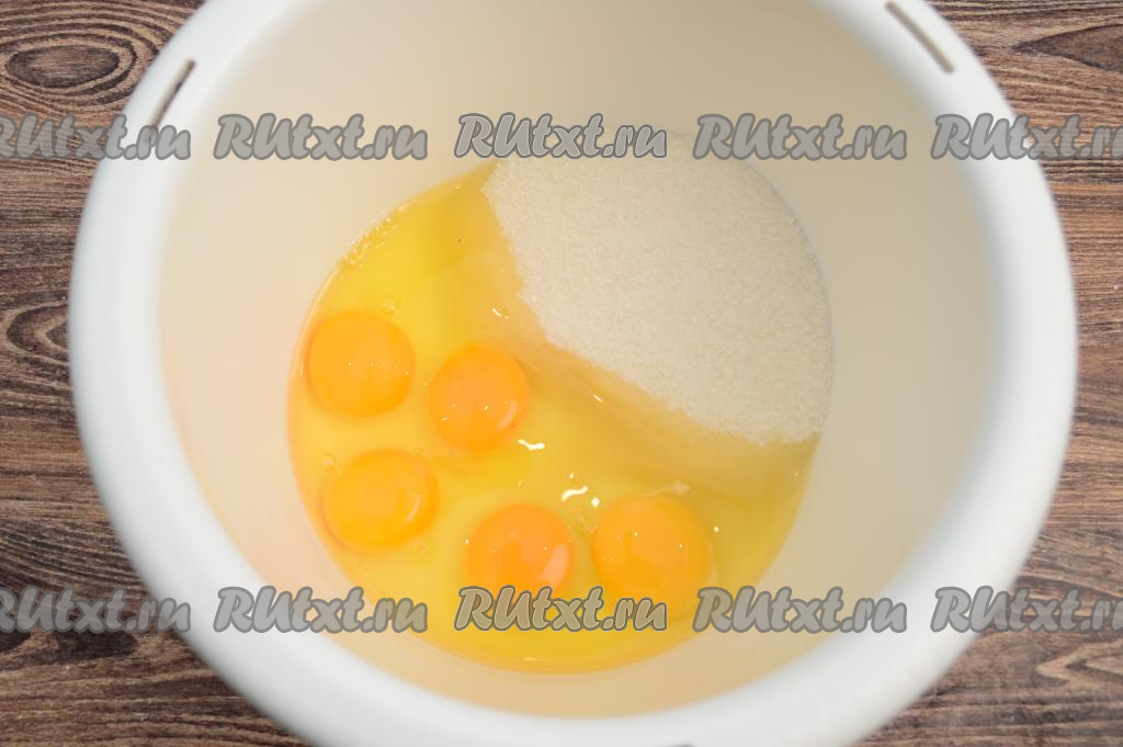 В чашу миксера для взбивания вбить яйца, сразу всыпать сахар.