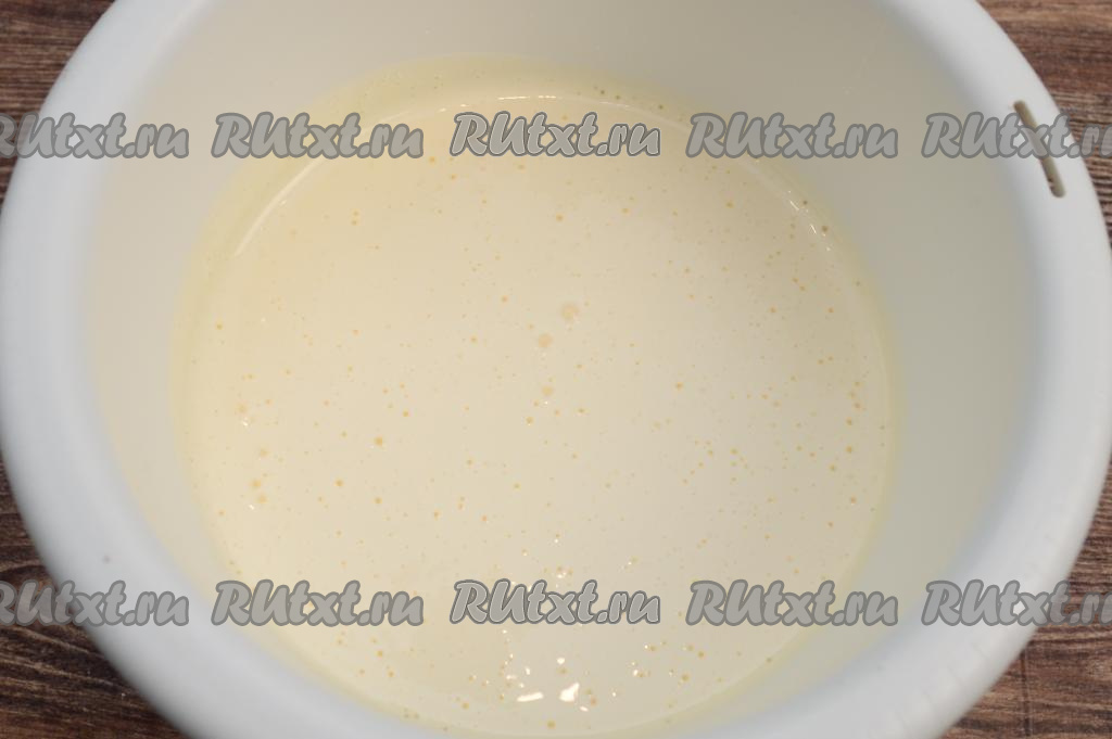На максимальной скорости миксера взбить яйца с сахаром в течение 6-7 минут. Масса станет светлой и увеличится в объёме.