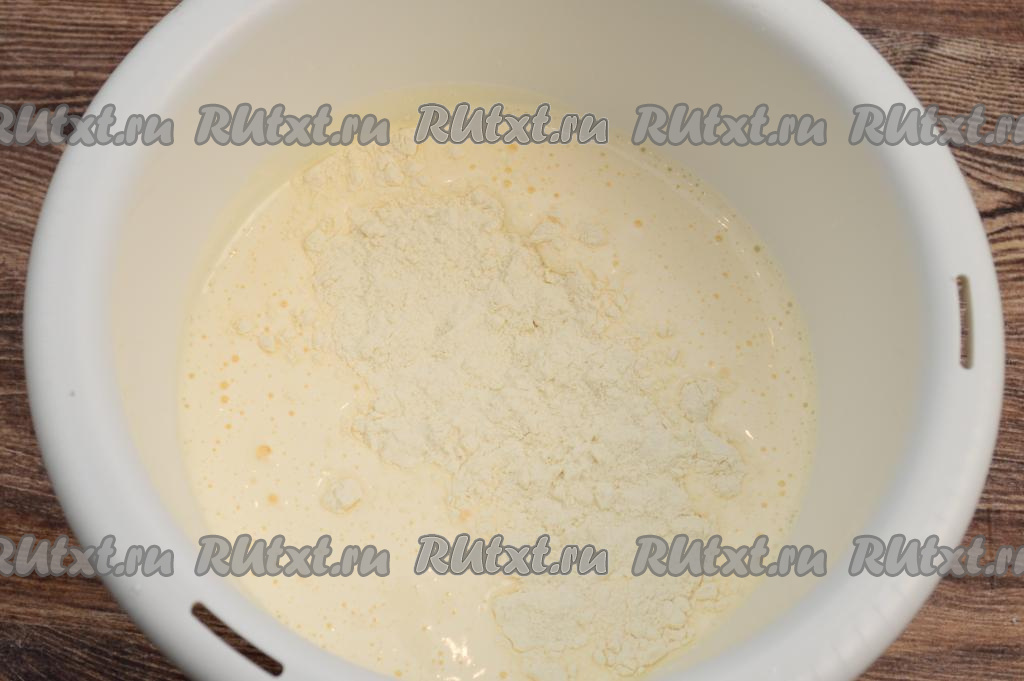 Мне для получения теста для бисквита нужной густоты потребовалось добавить 200 грамм муки. Но количество муки, которое придётся добавить, зависит от размера куриных яиц и от самой муки. Так что я советую всыпать муку небольшими порциями, хорошо вмешивать и следить за густотой бисквитного теста.