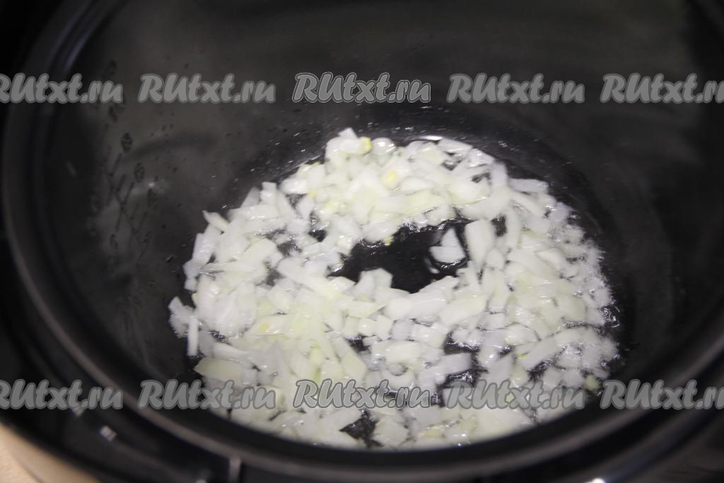 В чашу мультиварки влить растительное масло, сразу выставить на 15 минут режим "Жарка". Добавить в чашу мультиварки мелко нарезанный лук и обжарить его до прозрачности (в течение 4-5 минут), не забывая иногда перемешивать.