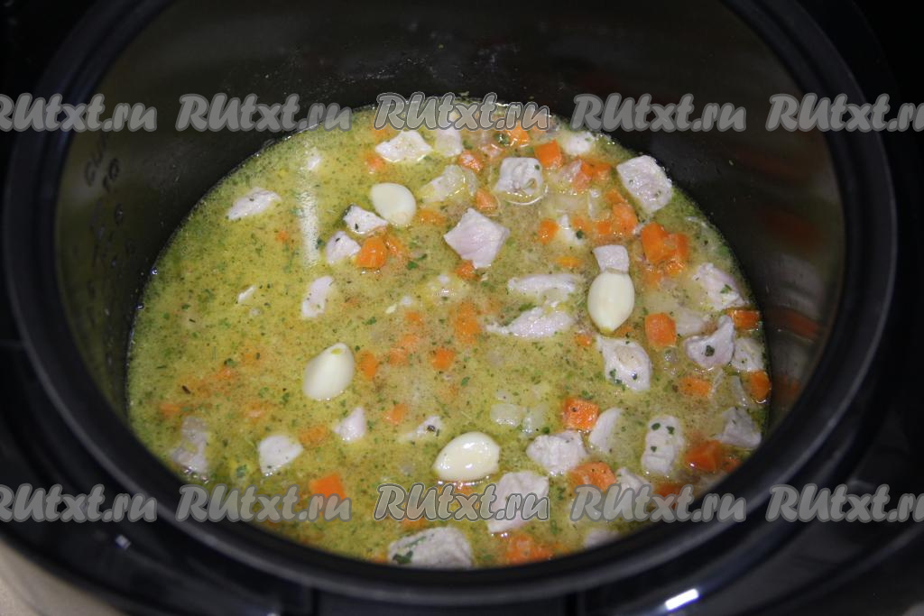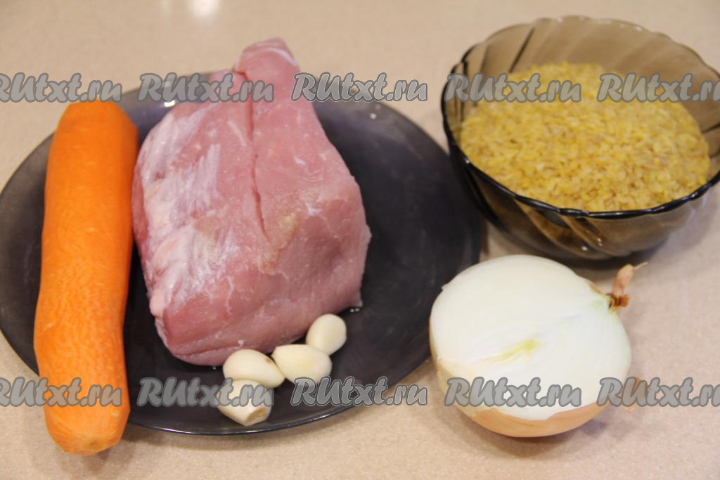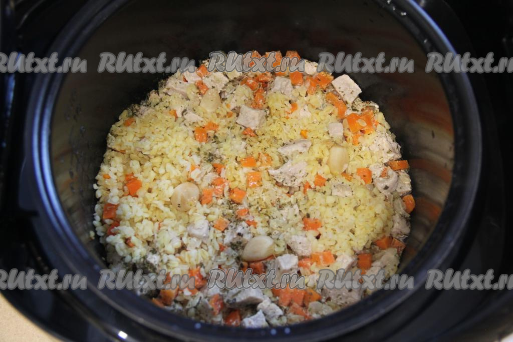 Перемешать булгур со свининой и солью, сверху выложить очищенные зубчики чеснока. Закрыть крышку мультиварки.