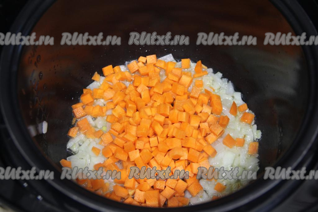 К обжаренному луку выложить морковку, нарезанную на небольшие кубики, перемешать, обжаривать овощи, время от времени помешивая, минут 5.