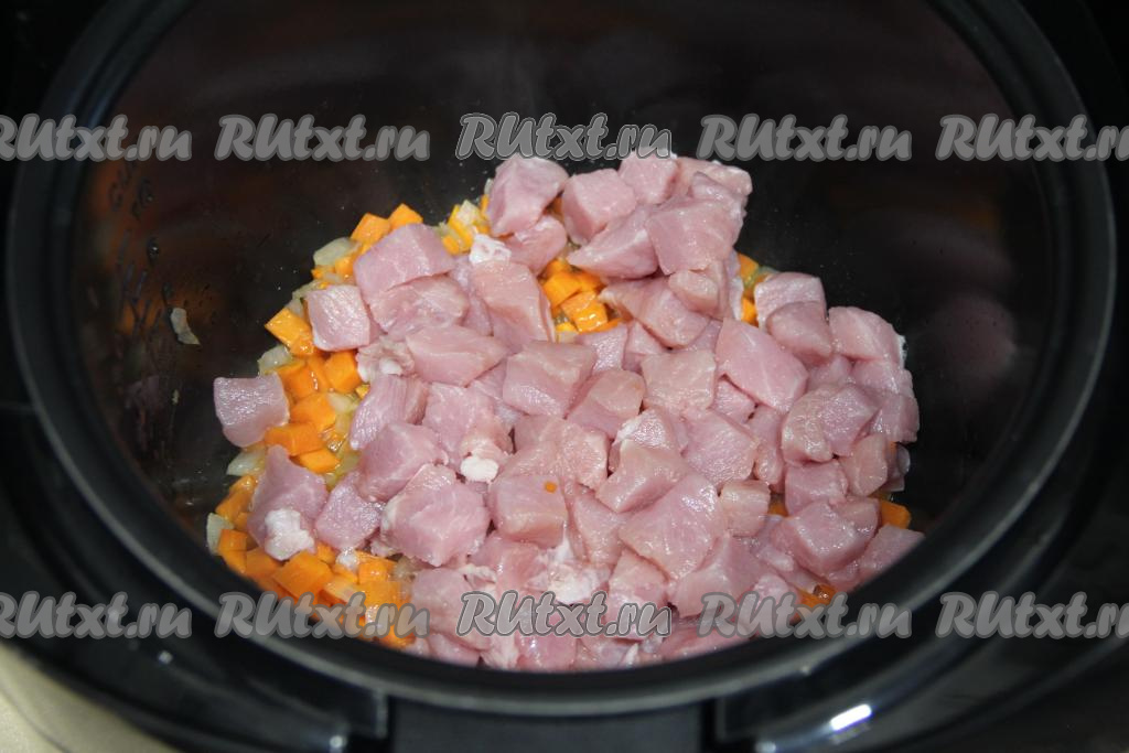 К обжаренным овощам выложить свинину, нарезанную на кубики с размером стороны 1,5 сантиметра, перемешать.