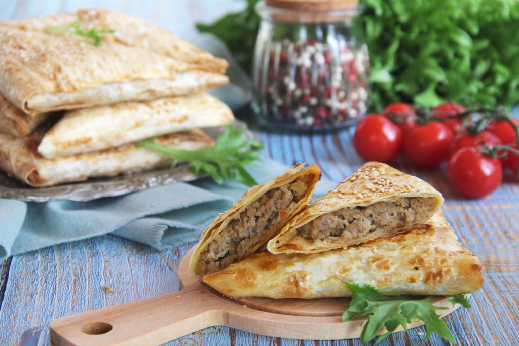 А вот как пирожок выглядит в разрезе. Сочетание сочного, нежного фарша и похрустывающей корочки из лаваша делает эту выпечку очень вкусной.