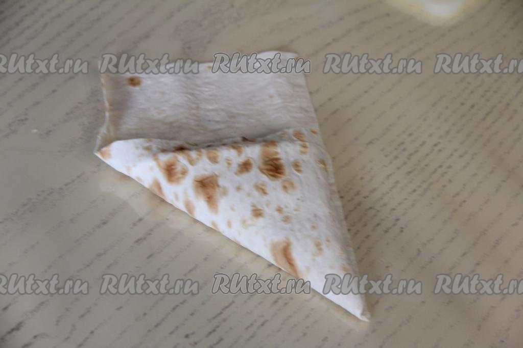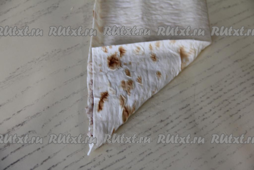 Загнуть чистый уголок лаваша на начинку, формируя треугольник.