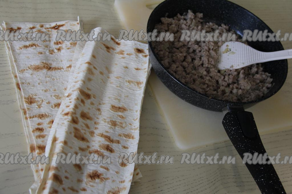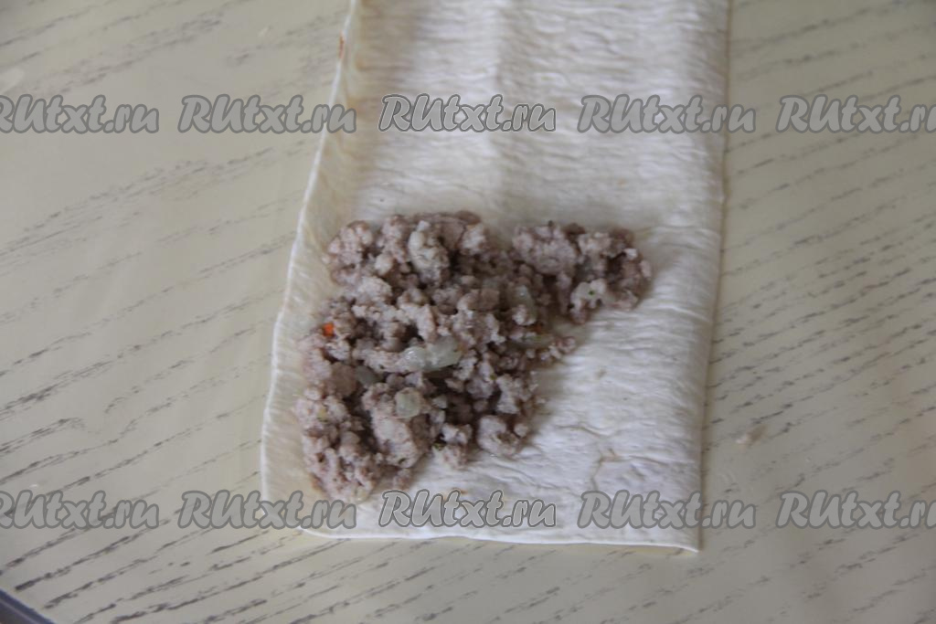 Мясную начинку тоже разделить на 8 равных частей. Выложить одну часть начинки на край полоски из лаваша, отступая от краёв лаваша, как на фото.