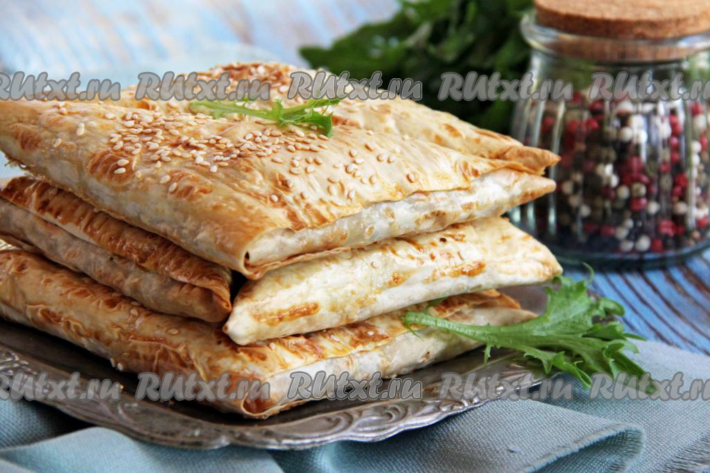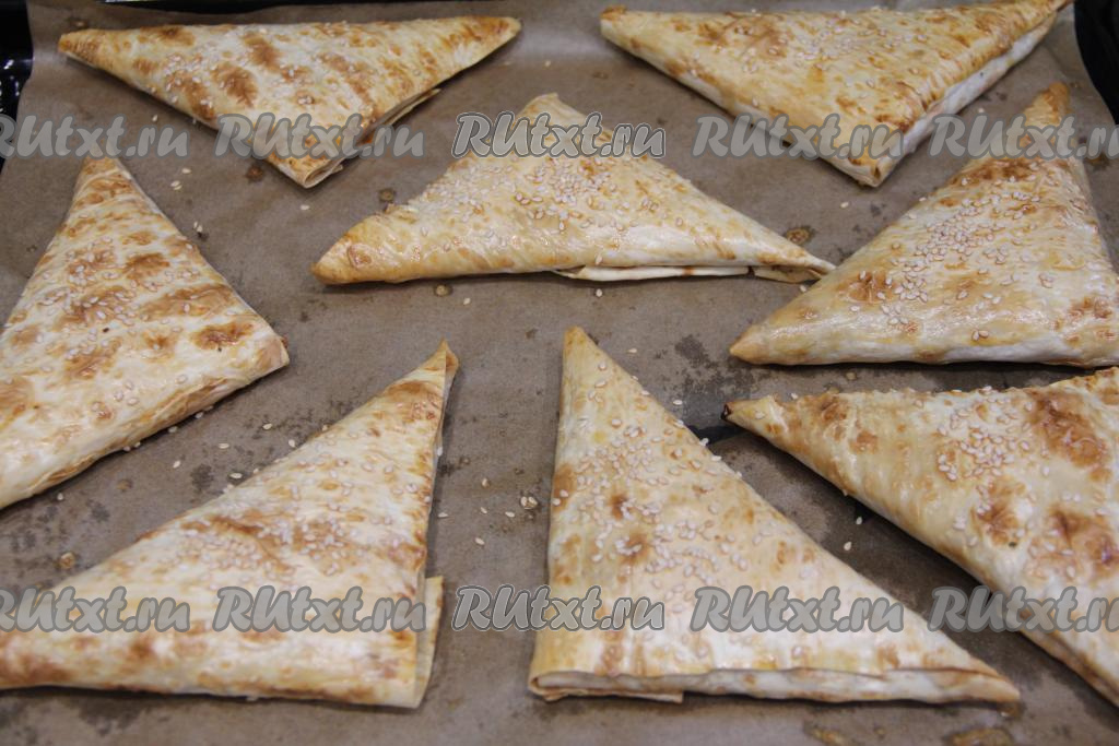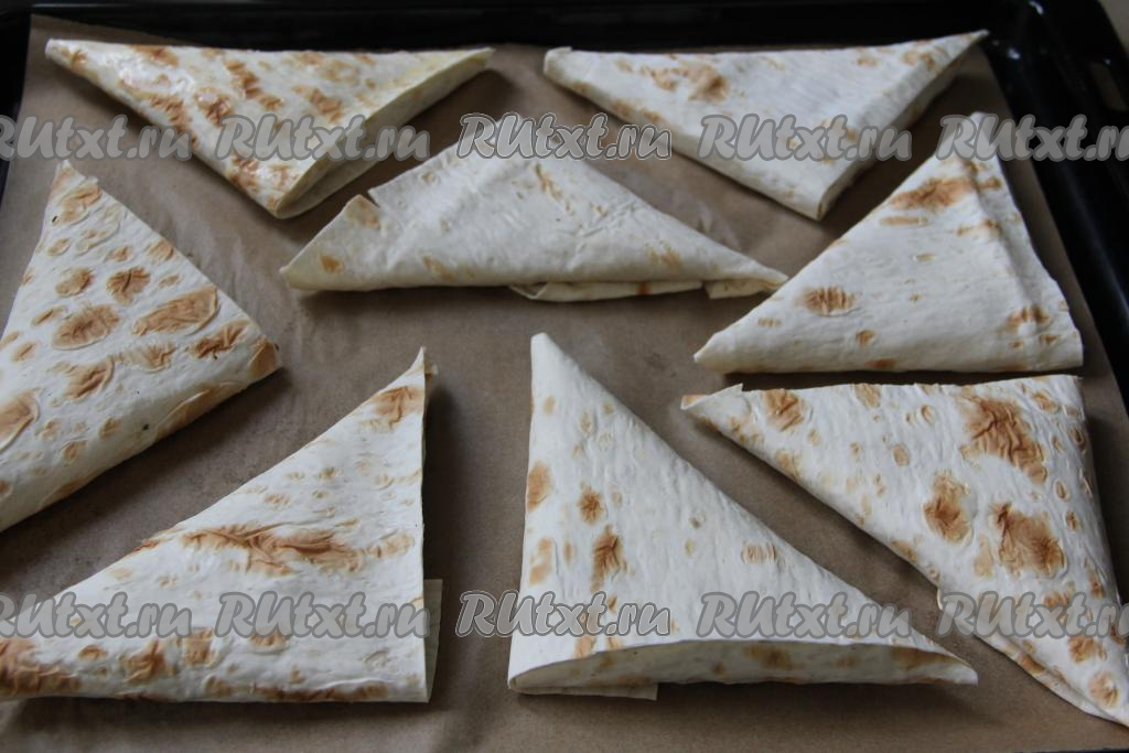 Таким же способом сформировать все треугольные пирожки из лаваша, выложить их на противень, застеленный пергаментом.