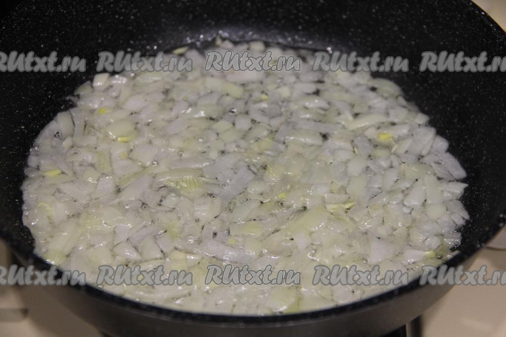 В сковороду влить растительное масло, разогреть, после этого выложить очищенную и мелко нарезанную луковицу. Жарить лук до прозрачности (ориентировочно в течение 4-5 минут), иногда помешивая, на среднем огне.