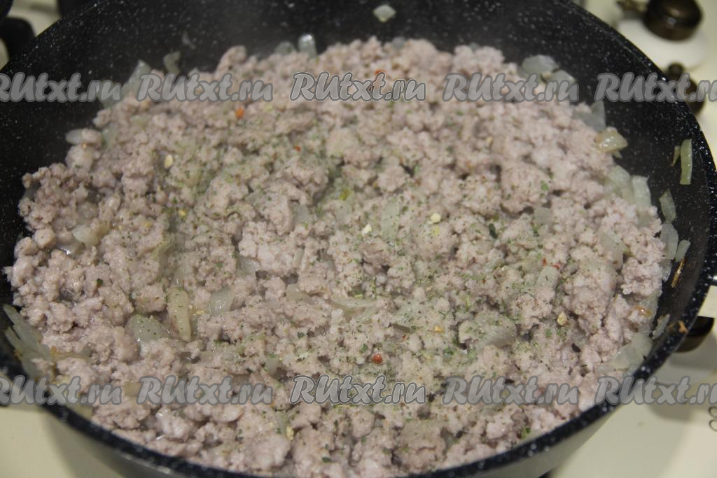 К обжаренному луку выложить мясной фарш.