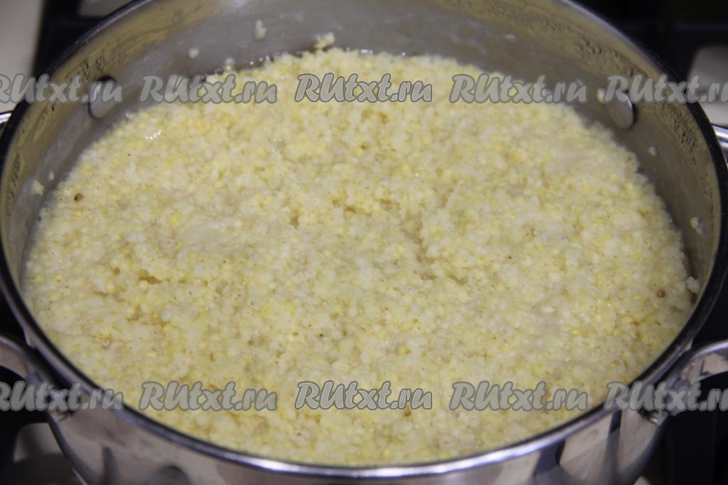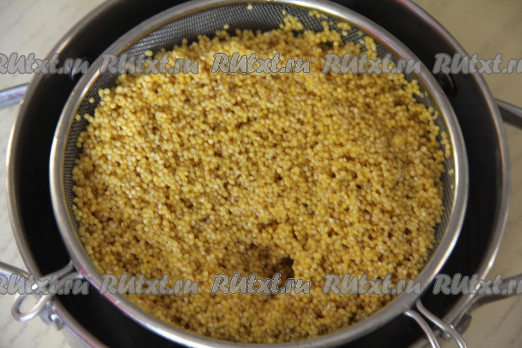 Прежде всего нужно сварить пшённую кашу. Для этого пшено нужно выложить в сито, очень хорошо промыть под горячей проточной водой (горячая вода уберёт с пшена горечь). Промытое пшено оставить на несколько минут в сите, чтобы стекла лишняя вода.
