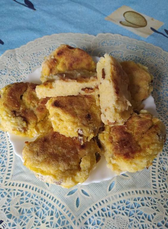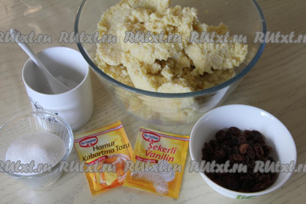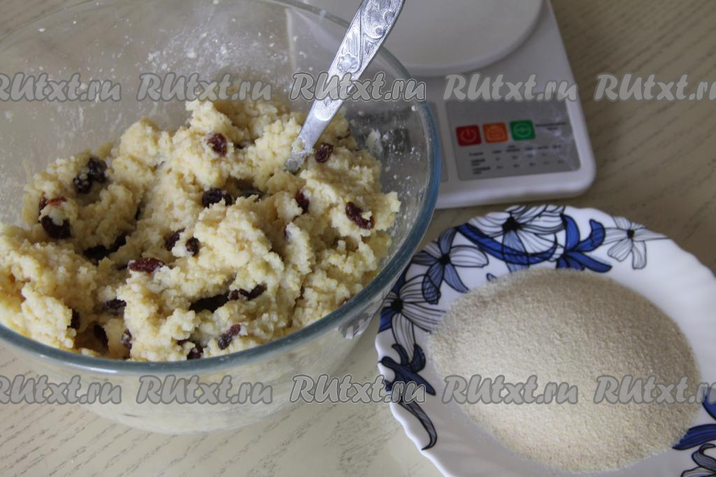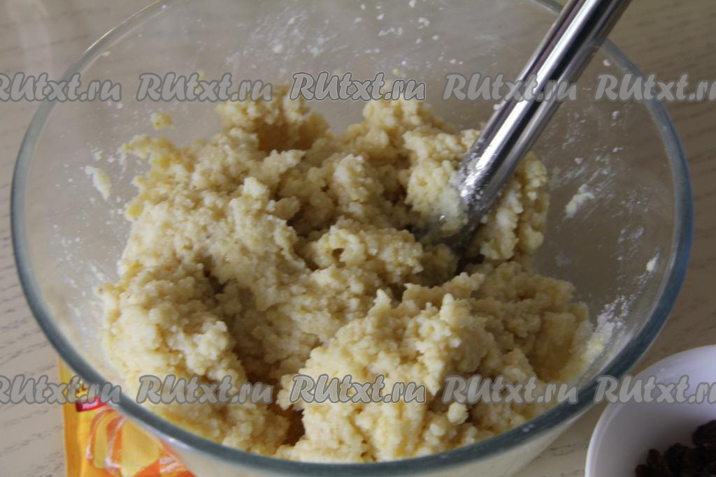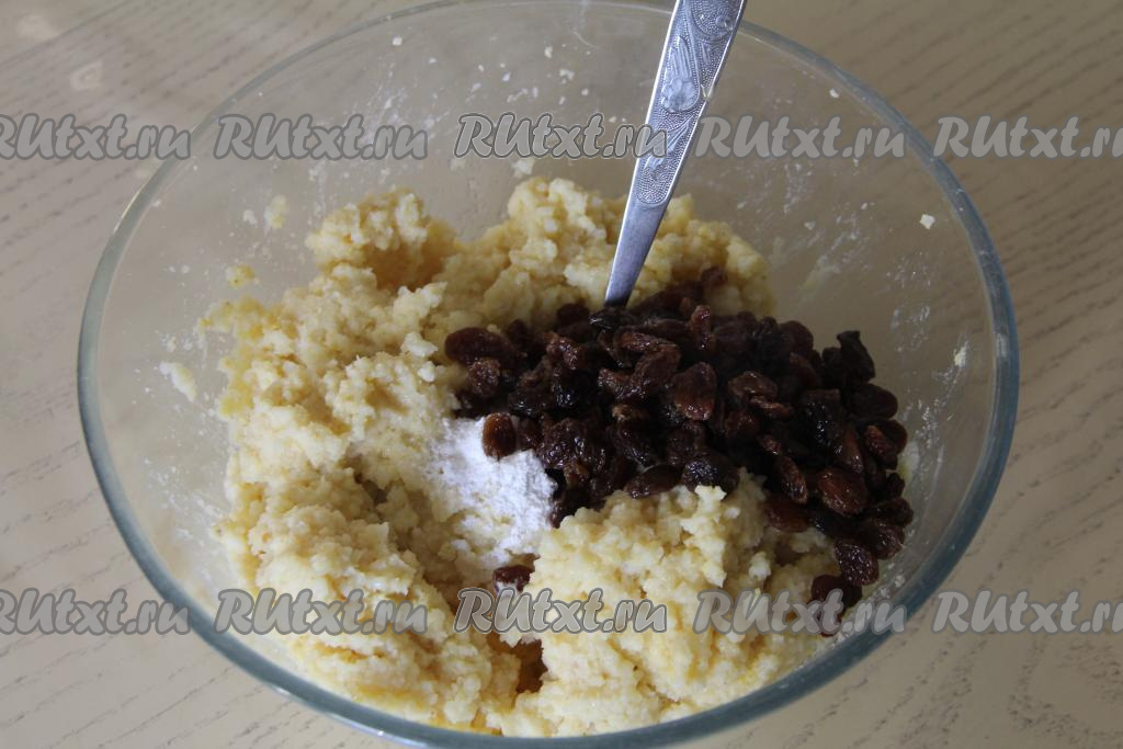 В получившуюся пшённую массу всыпать разрыхлитель, добавить изюм.