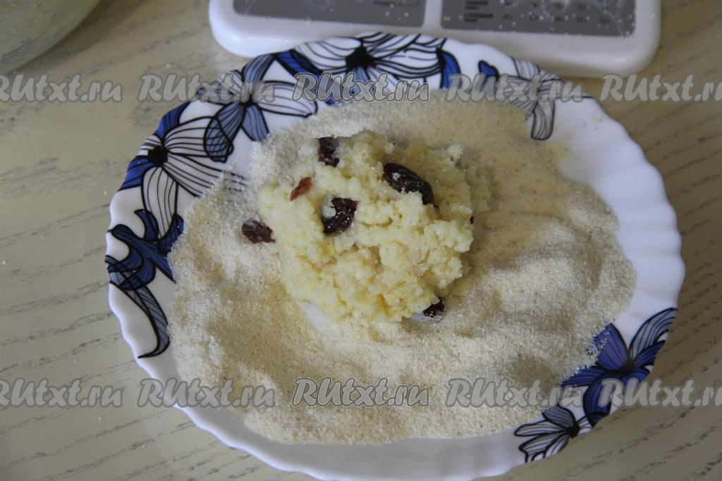 Разделить массу на небольшие части (я разделила на 15 частей весом по 90 грамм). На тарелку насыпать манку. Выложить одну часть пшённой массы на тарелку.