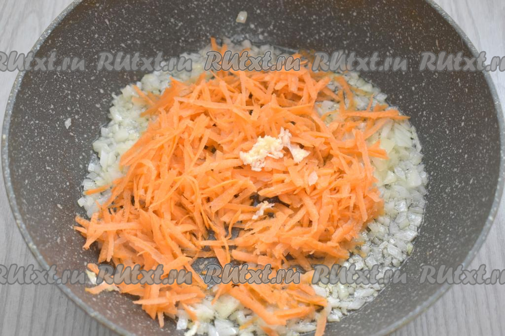 Морковь и чеснок очищаем. Морковь, натёртую на крупной тёрке, и чеснок, пропущенный через пресс (или натёртый на мелкой тёрке), добавляем к обжаренному луку, перемешиваем. Обжариваем овощи 4-5 минут, время от времени перемешивая.