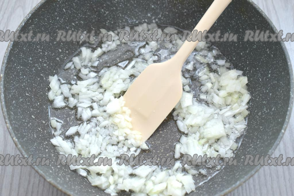 Пока варятся овощи, обжарим морковку с луком. Для этого разогреваем растительное масло в сковороде, выкладываем мелко нарезанную очищенную луковицу. Обжариваем лук, иногда помешивая, на среднем огне до прозрачности (минуты 3).