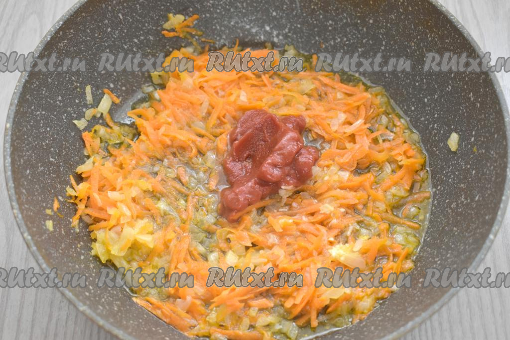 К обжаренным овощам добавляем томатную пасту и 3-4 столовых ложки бульона из кастрюли. Перемешиваем, тушим овощи в томатной пасте 3 минуты.