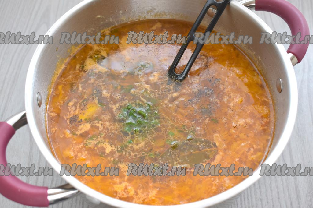 Затем перчим, добавляем зелень, перемешиваем, доводим щи из утки до кипения, уменьшаем огонь, провариваем 1 минуту и убираем с огня. Даём щам настояться 10-15 минут под крышкой.
