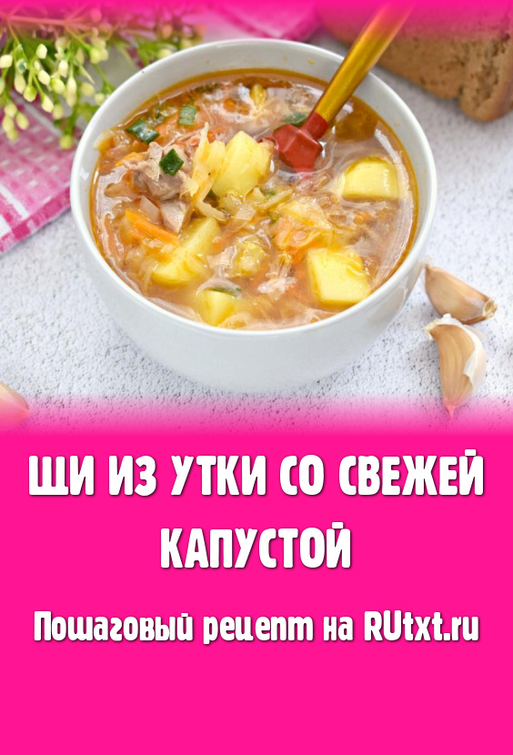 Щи - одно из любимых блюд в моей семье. Предлагаю сварить щи из утки со свежей капустой. Блюдо получается сытным, очень вкусным. Мясо утки придаёт ему особую насыщенность и аромат. Такие щи всегда вносят приятное разнообразие в семейное меню. При подаче их можно дополнить сметаной.