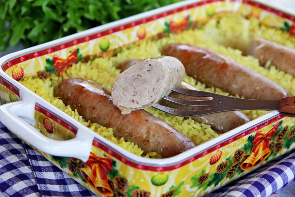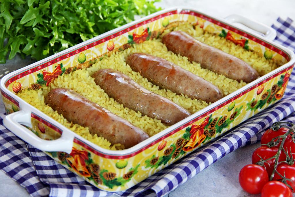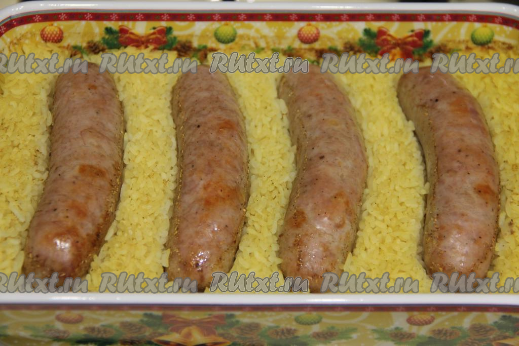 Готовность блюда проверяйте по рису, если он стал достаточно мягким, значит можно доставать из духовки. Если же рис твердоват, можно немного увеличить время приготовления, но в этом случае желательно перевернуть купаты, чтобы они не пересушились.