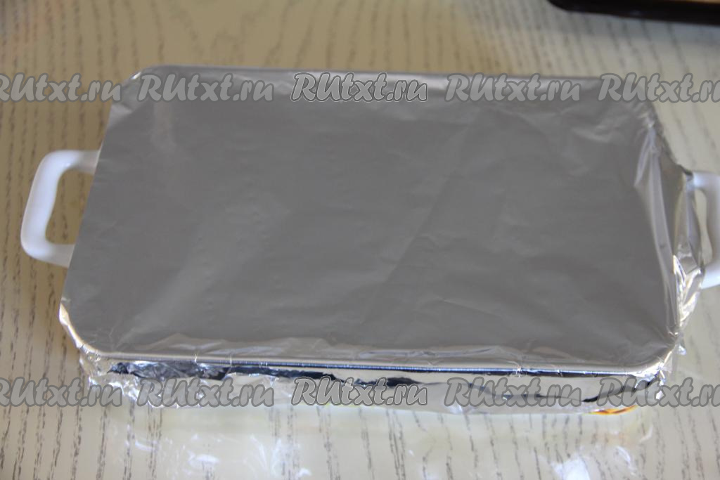 Накрыть форму фольгой и поставить в разогретую до 200 градусов духовку. Готовить купаты с рисом 30-35 минут.