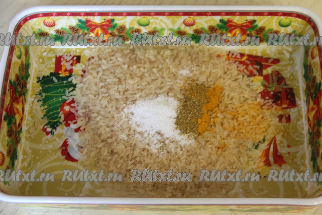 В жаропрочную форму (я взяла форму размером 25 сантиметров на 16 сантиметров) выложить рис, добавить соль и специи по вкусу.