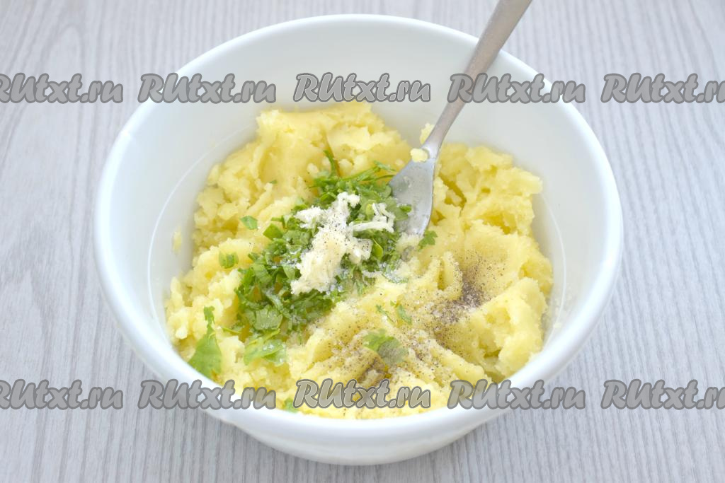 Зелень (у меня - петрушка) моем, нарезаем мелко. Очищаем чеснок. К картофельному пюре добавляем нарезанную зелень и пропущенный через пресс чеснок, перчим, тщательно перемешиваем. Пробуем на вкус, если нужно, досаливаем пюре.