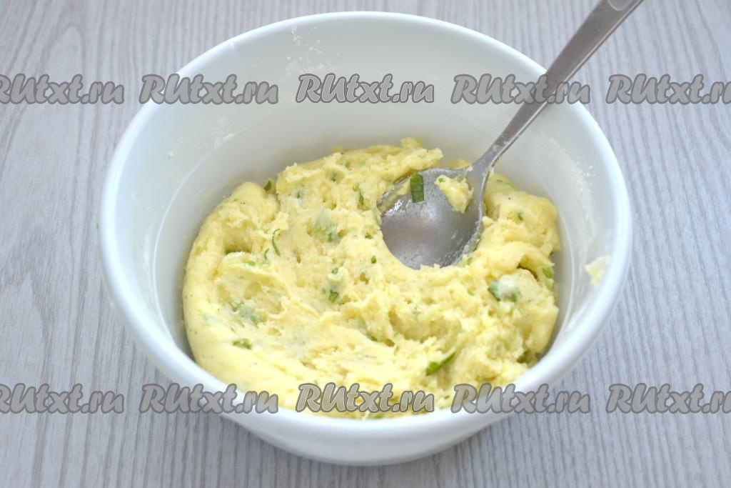 В картофельное пюре вливаем 1 столовую ложку растительного масла, перемешиваем.