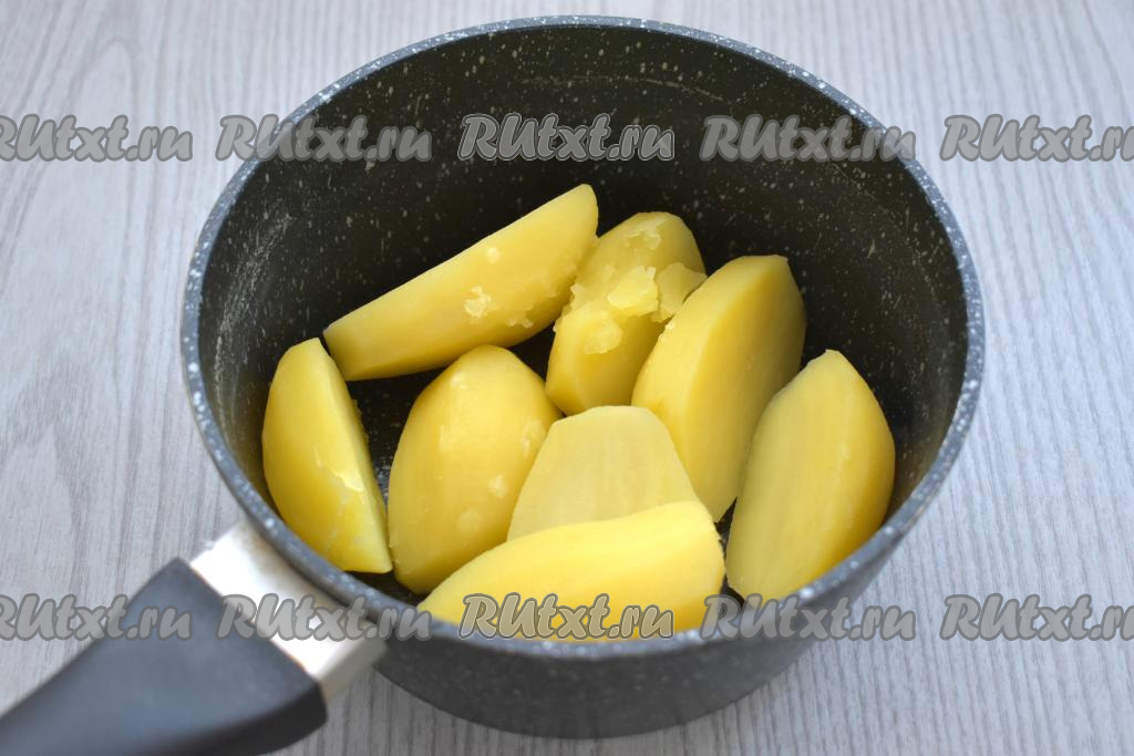 Очищаем картофель, разрезаем пополам, складываем в кастрюлю, заливаем полностью холодной водой, ставим на сильный огонь. После закипания варим картофель в подсоленной воде до готовности (ориентировочно минут 20-25, готовая картошка будет легко прокалываться ножом). Затем выливаем воду, в которой варился картофель.