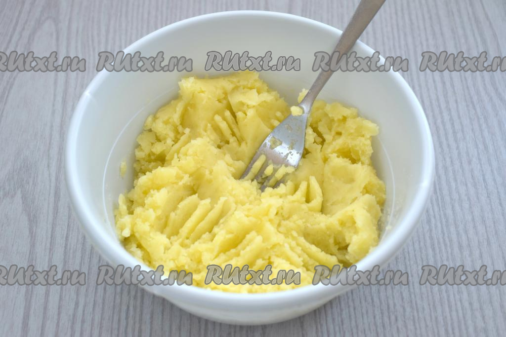 Перекладываем варёный картофель в миску и разминаем его вилкой (или толкушкой) до получения пюре.