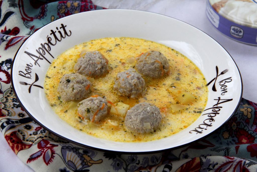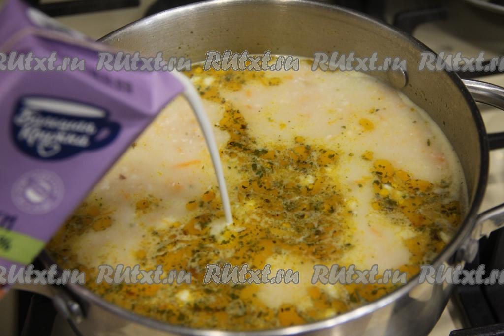 Довести суп с фрикадельками, сливками и плавленным сыром до кипения, снять с огня.